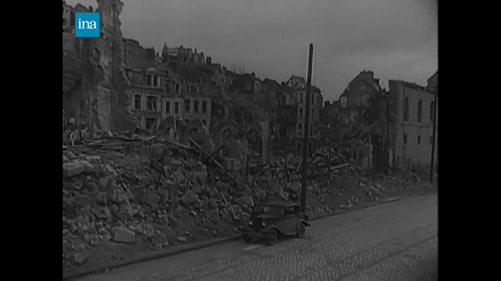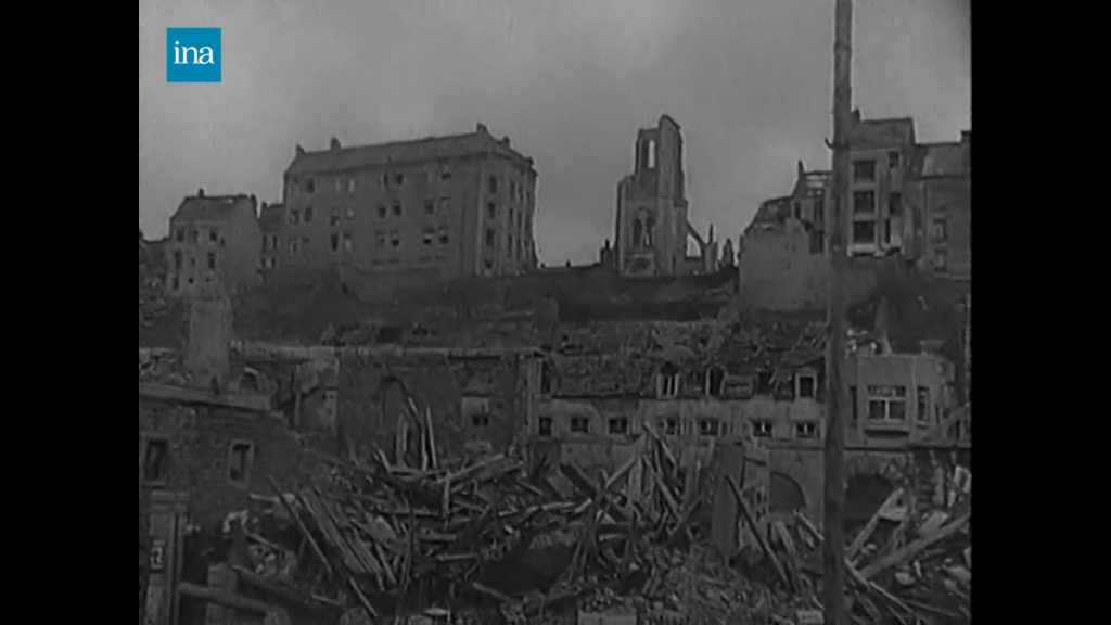 La ville à la libération en 1945, capture d’écran de la vidéo de l’INA: Ruines de Boulogne sur Mer, Calais ; décombres de Marseille, Journal Les Actualités Françaises – 18.01.1945 – 02:17 – vidéo. Dans l’ordre on peut apercevoir différent point de vue du quartier Saint-Pierre avec les ruines de l’église Saint-Michel en fond. La dernière capture semble montrer le port et Capécure.