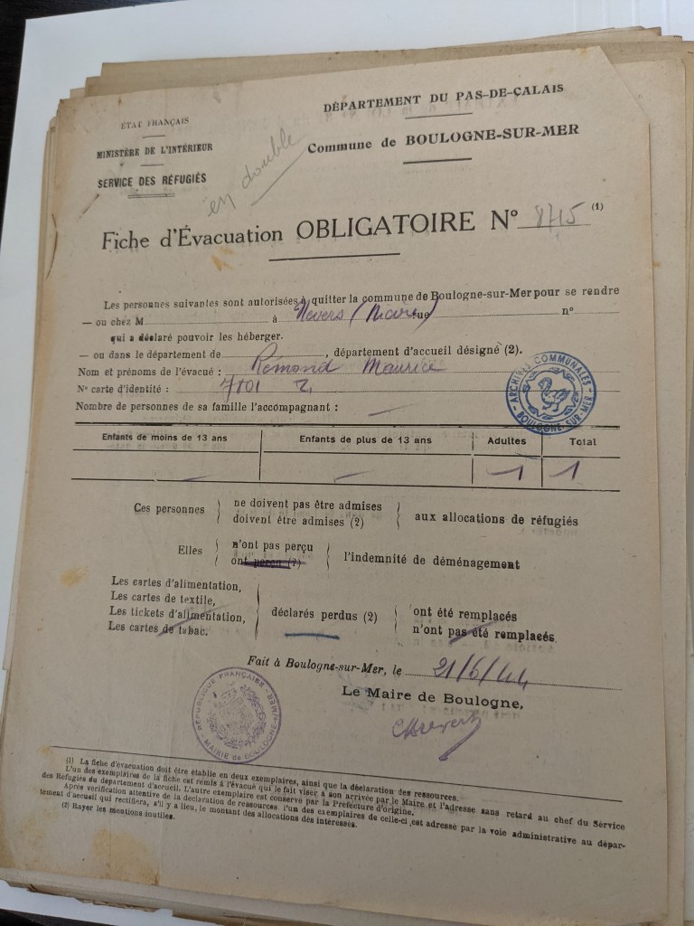 Fiches d’évacuation obligatoire de mes arrière-grands-parents pour la Nièvre faites en 1944. Ma grand-mère et ses parents seront eux évacués vers la Marne. Source: Archives municipales de Boulogne-sur-Mer.