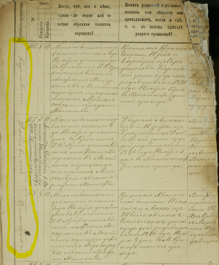 Une fois le registre identifié, il est nécessaire de chercher l’acte en question. Première difficulté, le registre est rédigé en russe! L’administration impériale a en effet imposée la langue au sein des registres. Une manière plus facile de chercher pour les personnes non expertes en russe est de lire le nom écrit en verticale et en marge de l’acte. Il s’agit du nom de la personne concernée (entouré en jaune)!