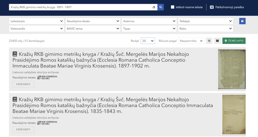 Le second site étant genmetrika.eu , plus simple d’utilisation, il comprend cependant moins de registres paroissiaux. On trouvera dessus les registres de Vaiguva, village du père de Gertruda, mais pas ceux de Kražiai. A savoir que les registres catholiques remontent facilement jusqu’au 17e siècle. La Lituanie est restée longtemps « païenne » , sa conversion au christianisme date du 14e siècle.