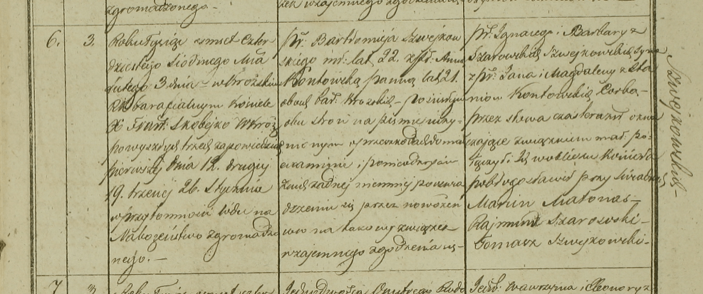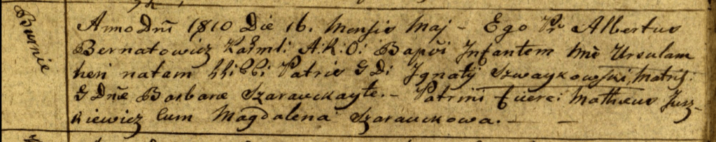 Du côté de son grand-père maternel, Gertruda descend de Ignacy (1776-1831) et de Barbara SZAROWSKA/ SZARAWSKAITE (1781-1831). A la naissance de sa tante Ursula en 1810, ces derniers sont cités comme étant Generosus Dominus, un qualificatif soulignant la noblesse de la famille. C’est la seul fois que ce titre est mentionné. Erreur? Ou courte acquisition du titre avant que’ ce dernier soit retiré? Des recherches poussées permettront d’y répondre.