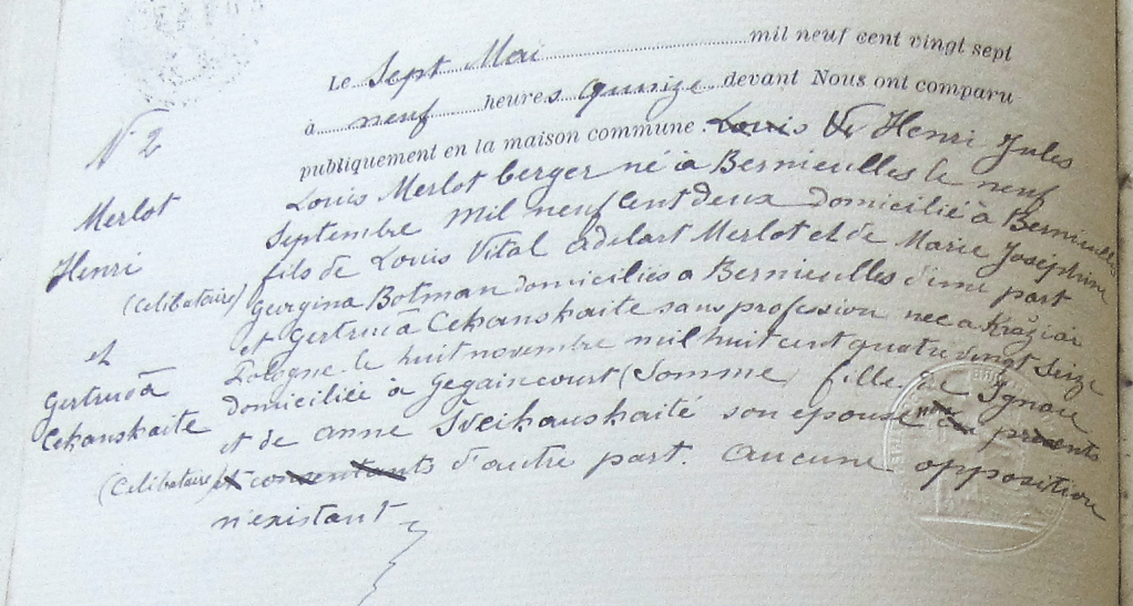 Le 7 mai 1927, dans la mairie de Bernieulles, village du Boulonnais, le mariage de Henri MERLOT (1902-1984) est célébré. 3e enfant de Louis Vital MERLOT et de Marie-Joséphine Georgina BOTMAN, il épouse Gertruda CEKANSKAITE (1896-1969). C’est par cette arrière grande tante que j’ai commencé mes recherches à l’étranger, et qu’est née ma passion pour la généalogie étrangère.