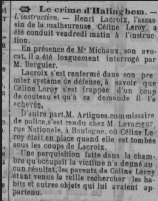 En moins de deux jours, la presse régionale s’empare de l’affaire, et une véritable enquête est menée par certains journalistes dont ceux du Grand Echo du Nord, « ancêtre » de la Voix du Nord et ceux du Mémorial artésien. L’enquête cherche à comprendre les « motifs » du meurtrier même si en aucun cas un tel acte ne peut-être justifié. Selon la presse, il en ressort que Céline aurait refusé à plusieurs reprises les avances d’Henri qu’elle connaissait depuis 1 an. Ce dernier se montra très assistant et envoyant une lettre à Céline. Cette lettre disparue au moment du procès, contenait vraisemblablement des menaces pour obliger la jeune fille à épouser Henri. Son comportement plus qu’inquiétant ne s’arrêta pas là. La vieille du meurtre, l’assassin avait eu vent que Céline était rentrée chez ses parents à Hubersent. C’est donc « naturellement » qu’Henri décida de s’y rendre et de la trouver! L’ayant croisé au cabaret FOURNIER, Céline décida de rentrer chez ses parents et de les informer « qu’elle ne voulait plus revoir LACROIX ». Ce dernier en avait décidé autrement et s’introduit dans la maison des LEROY, dans la chambre à coucher des sœurs Céline et Gabrielle pour encore réitérer ses menaces dans un language fleurie en menaçant de la « coquer » dont le sens selon les partis oscille entre violer et tuer…. Le soir tombé, Henri décida de dormir dans une grange non loin de sa victime.