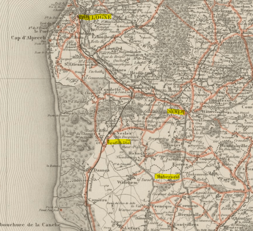 En effet, depuis 1848, Boulogne est relié à la ligne de chemin de fer de Longueau passant par Amiens et Neufchâtel, existant toujours. La seconde ligne est celle allant de Boulogne à Saint-Omer et passant par Samer. Ouverte en 1874, elle fermera entre 1959-1968. Ainsi, en habitant Hubersent, Céline devait se rendre soit à Neufchâtel ou à Samer pour rejoindre la gare et atteindre ensuite Boulogne. le village est relié par deux routes départementales existant encore de nos jours, respectivement connues sous le nom de D113 et D901. Les deux villes sont situées respectivement à 2h à pied du village, dans l’hypothèse d’absence de moyens de locomotion pour Céline. Ces précisions logistiques se révèlent cruciales pour comprendre les conditions dans lesquelles au petit matin du 19 mars, Céline sera retrouvée morte au Mont de Niembourg à Halinghen.