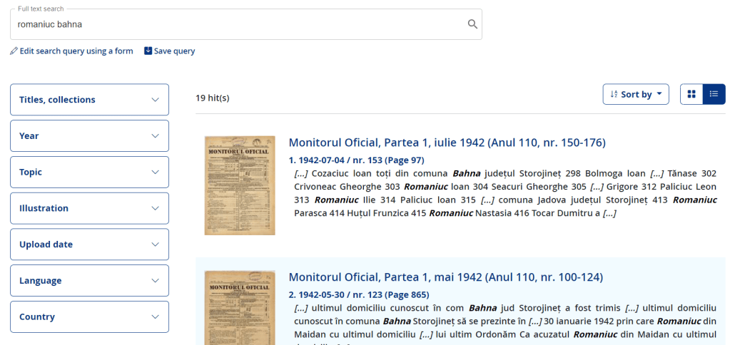 On voit donc que l’on obtient que 19 résultats (hits) permettant de les consulter rapidement. Le premier résultat renvoie au bulletin officiel du Royaume de Roumanie du 1er juillet 1942. Il nous apprend qu’un dénommé Ioan Romaniuc, domicilié à Banilă pe Siret (Banyliv Pidhirnyi en Ukraine) a perdu « par décision du Ministère de la Justice sa nationalité roumaine pour être parti du pays de manière clandestine ou frauduleuse, indifféremment du motif« .