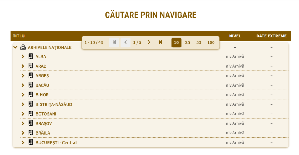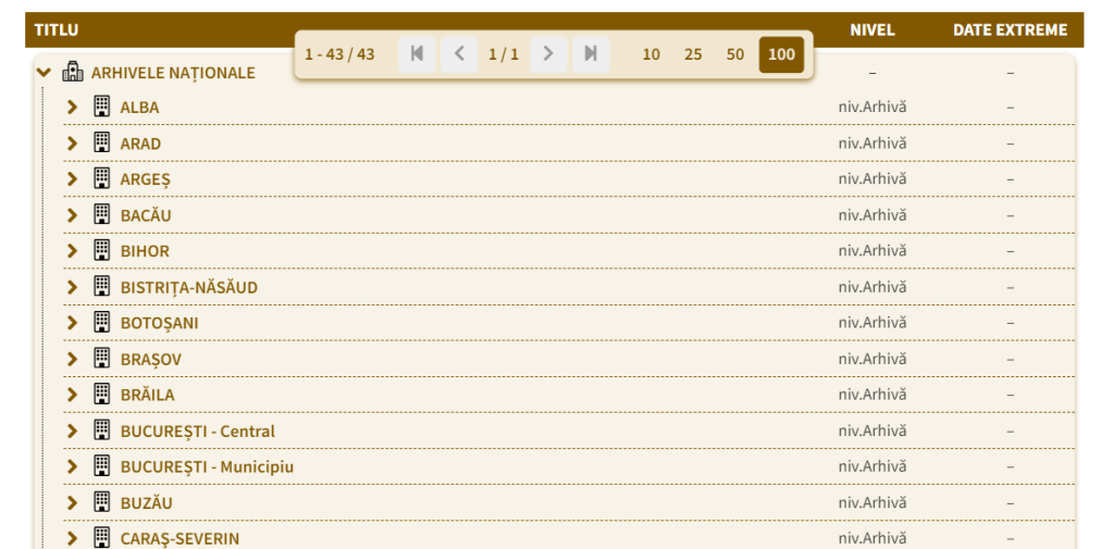 II. Vous accéderez à cette page, listant chaque département par ordre alphabétique. Pour accéder aux départements suivant, il faut poser la souris sur l’onglet arhivele nationale (archives nationales), puis cliquer sur la flèche. Les nombres 10/25/50/10 signifient le nombre d’onglets que vous voulez afficher sur la page.