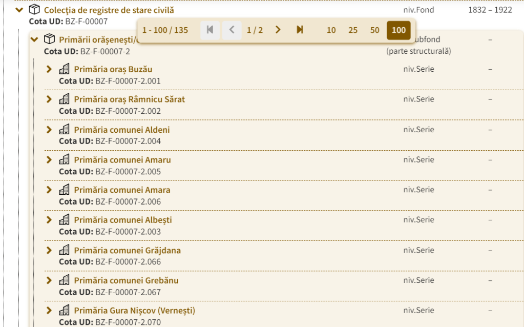 III. Par exemple, je souhaite accéder au département de Buzău, je décide donc de cliquer sur 100 pour afficher l’ensemble des résultats. Puis je clique sur la flèche à côté de Buzău, là encore, en cliquant sur 100 pour afficher le plus de résultats.