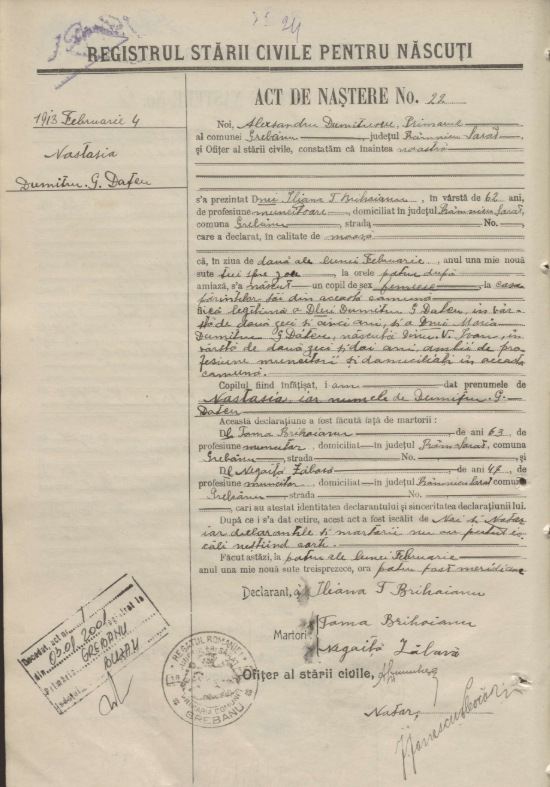 | Registrul stării civile pentru născuți Act de naștere No. 22 Noi, Alecsandru Dumitrescu, Primarul al comunei Grebănu, județul Râmnicu Sarat și Ofițer al stării civile, constatăm că înaintea noastră S’a prezintat Dnei Iliana T Brihoianu, în vârstă de 62 ani, de profesiune muncitoare, domiciliat în județul Râmnicu Sarat, comuna Grebănu, strada —–, no —– care a declarat, în calitate de moașă că, în ziua de două ale lunii Februarie, anul una mie nouă sute trei spre zece , la orele patru după amiază, s’a născut un copil de sex femeie, la casa părinților săi din această comună. Fiică legitimă a Dlui Dumitru D. Datcu, în vârstă de două zeci și cinci ani, și a Dnei Maria Dumitru D. Datcu, născută Dinu V. Ivan, în vârstă de două zeci și doi ani, ambii de profesiune muncitori și domiciliați în această comună. Copilul fiind înfățișat, i-am dat prenumele de Nastasia, iar numele de Dumitru G. Datcu. Această declarațiune a fost făcută față de martorii: Dl Toma Brihoianu, de ani 63, de profesiune muncitor, domiciliat în județul Râmn Sarat, comuna Grebănu, strada —–, no —– Dl Negoiță Zăbavă, de ani 47, de profesiune muncitor, domiciliat în județul Râmn Sarat, comuna Grebănu, strada —–, no —– Cari au atestat identitatea declarantului și sinceritatea declarațiunii lui. După ce i s’a dat cetire, acest a fost iscălit de Noi și notariar, declaranțile și martorii nu au putut iscăli neștiind cărți. Făcut astăzi, la patru ale lunii Februarie anul una mie nouă sute treisprezece, ora patru post meridiane | Registre d’état civil pour les naissances Acte de naissance n.22 Nous, Alecsandru Dumitrescu, Maire de la commune de Grebănu, Département de Râmnicu Sărat et officier de l’état civil, constatons que par devant nous, S’est présentée Mme. Iliana T. Brihoianu, âgée de 62 ans, manouvrière de profession, domiciliée dans le département de Râmnicu Sărat, comune de Grebănu, qui a déclaré en qualité de sage-femme que, le 2 février 1913, à 4h de l’après-midi, est née un enfant de sexe féminin dans la maison de ses parents de cette commune. Fille légitime de M. Dumitru D. Datcu, âgé de 25 ans et de Mme. Maria Dumitru D. Datcu, née Dinu V. Ivan, âgée de 22 ans, tous les deux manouvriers et domiciliés dans cette commune. L’enfant ayant été présenté, a reçu le prénom de Nastasia, et le nom de Dumitru G. Datcu. Cette déclaration a été faite devant les témoins: M. Toma Brihoianu, 63 ans, manouvrier, domicilié dans le département de Râmnicu Sărat, commune de Grebănu. M. Negoiță Zăbavă, 47 ans, manouvrier, domicilié dans le département de Râmnicu Sărat, commune de Grebănu. Qui ont attesté l’identité du déclarant et la sincérité de sa déclaration. Après lecture de l’acte, il a été signé par nous et le notaire, les déclarants et les témoins n’ont pas pu signer ne sachant lire. Fait aujourd’hui, le quatre février 1913, à 16h. |