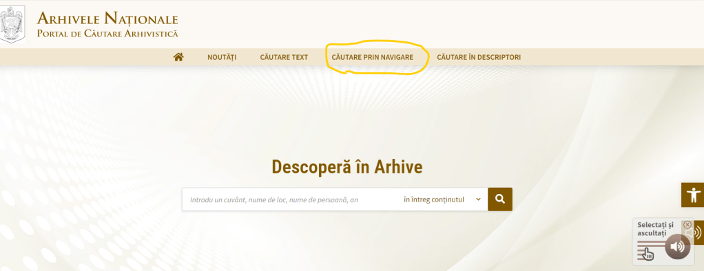 I. Pour consulter l’état civil roumain, il faut d’abord accéder au lien suivant https://descopera.arhivelenationale.ro/ et cliquer sur la page căutare prin navigare: